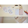 un carnet de 20 pages (10 pages de challenges et 10 pages de coloriages/points à relier), 60 gommettes dont 10 gommettes de renforcement positif, 2 "bons pour" et un scotch repositionnable.