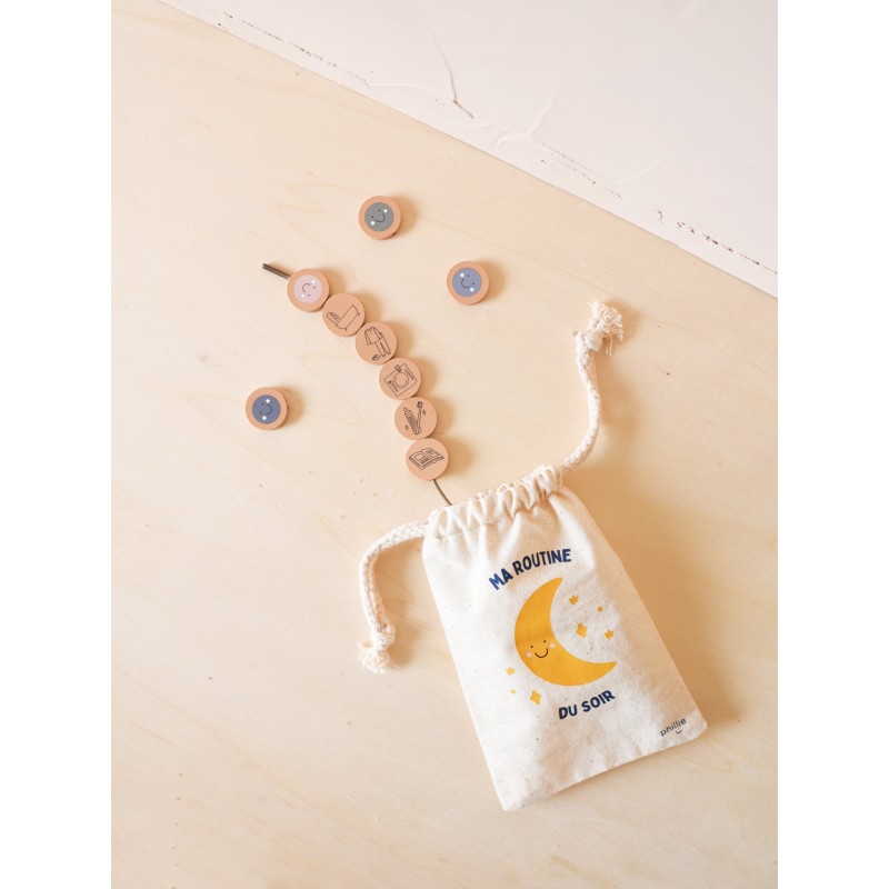 Le bracelet de routine soir est vendu en kit permettant à chaque famille de pouvoir composer la routine qui lui correspond. Ce bracelet est vendu dans un pochon contenant 10 perles et un fil élastique.