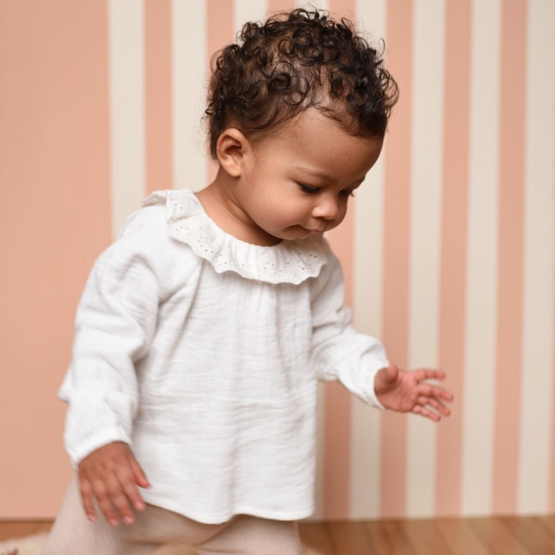 Une jolie blouse au style frais et délicat, en lange blanc. On adore son joli col volanté en broderie anglaise et ses manches longues élastiquées.